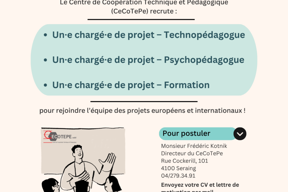 Le Centre de Coopération Technique et Pédagogique (CeCoTePe) recrute : Un·e chargé.e de projet – Technopédagogue Un·e chargé.e de projet – Psychopédagogue Un·e chargé.e de projet – Formation pour rejoindre l’équipe des projets européens et internationaux !   Pour accéder à l’offre d’emploi au format PDF, cliquer ici.